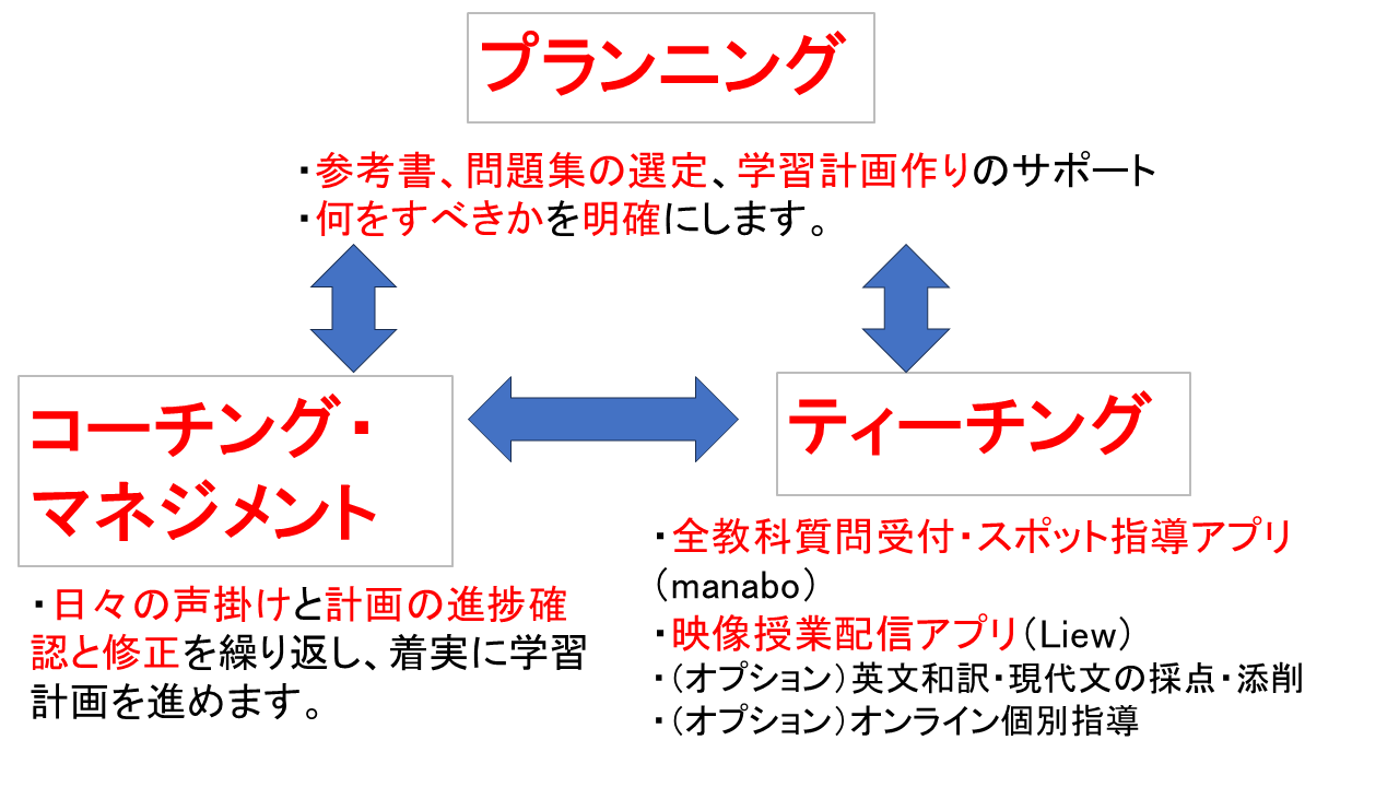 講師がプランニングとコーチング・マネジメントに日常的に直接関わり、質問受付は教材を問わず24時間365日全教科対応の駿台グループのmanaboをサービスに組み込んだものを、無理なく続けられる料金で提供します。オプションとして、英文和訳、現代文の採点・添削及び本格的な授業が必要な場面では、オンライン個別指導も選択できるようにしました。